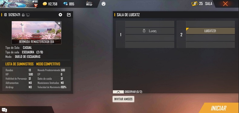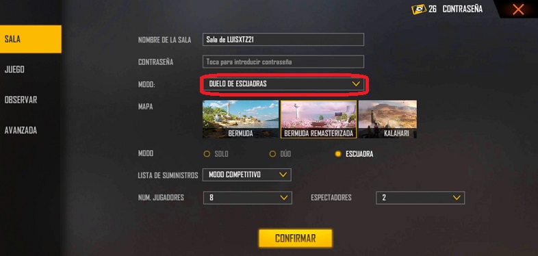 É importante colocar uma senha de acesso à sala para que apenas entre o jogador contra quem vamos jogar o PVP. Modo: Duelo de Esquadrão e selecione o mapa em que queremos jogar.